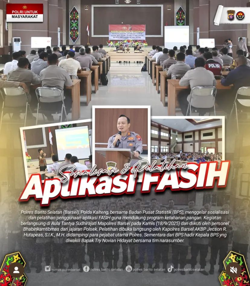 Polres Barito Selatan (Barsel), Polda Kalteng, bersama Badan Pusat Statistik (BPS), menggelar sosialisasi dan pelatihan penggunaan aplikasi FASIH guna mendukung program ketahanan pangan.